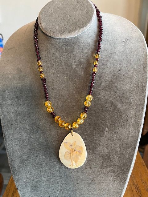 Citrine, Garnet and Carved Flower Abalone Shell